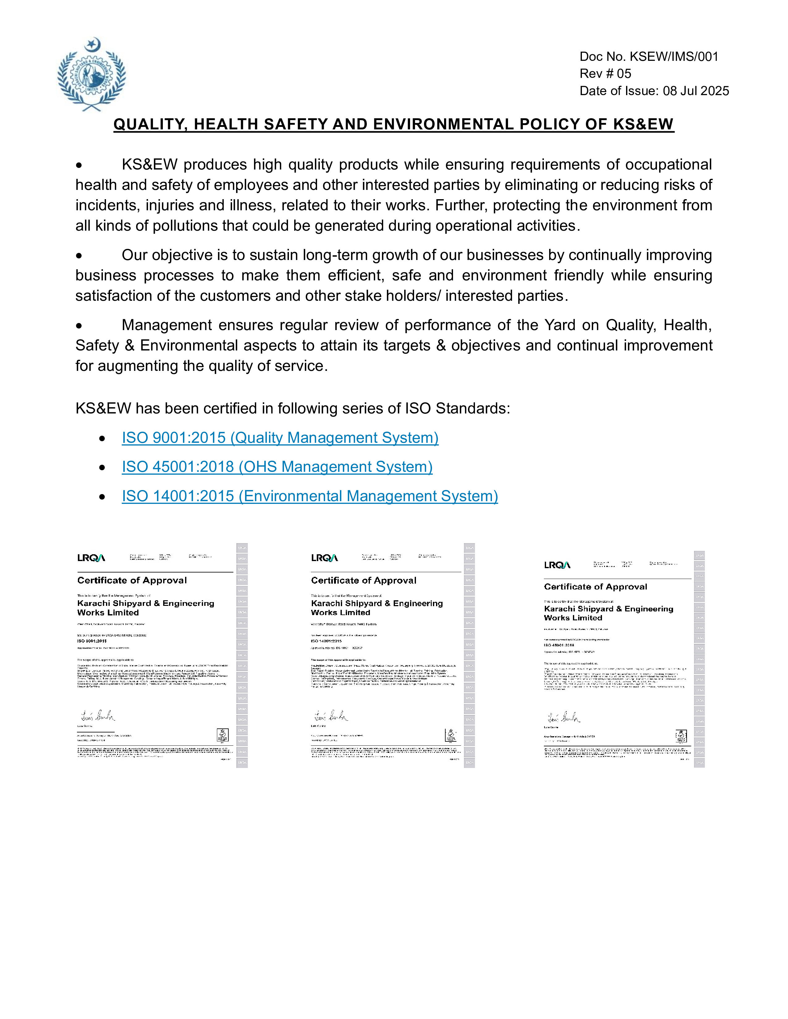 KS&EW is committed to ensure total satisfaction of all customers, by provision of quality products and services due time delivery at competitive prices. The yard looks forward to enhance its business portfolio as well as its contribution towards employment generation and economic development of the country, while maintaining a commitment for continual improvement. KS&EW management is also committed to implement principles of occupational health & safety and environment to comply with relevant legal requirements.